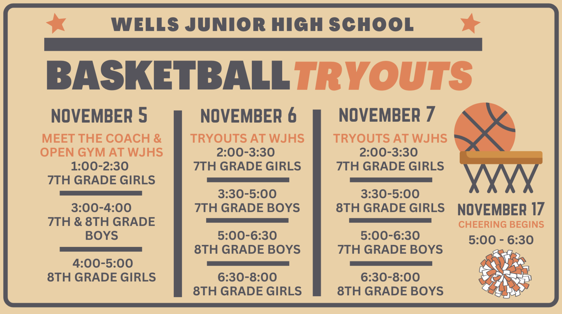 Basketball tryouts begin on November 5. Please see the schedule to the right. Cheerleading begins on November 17.
